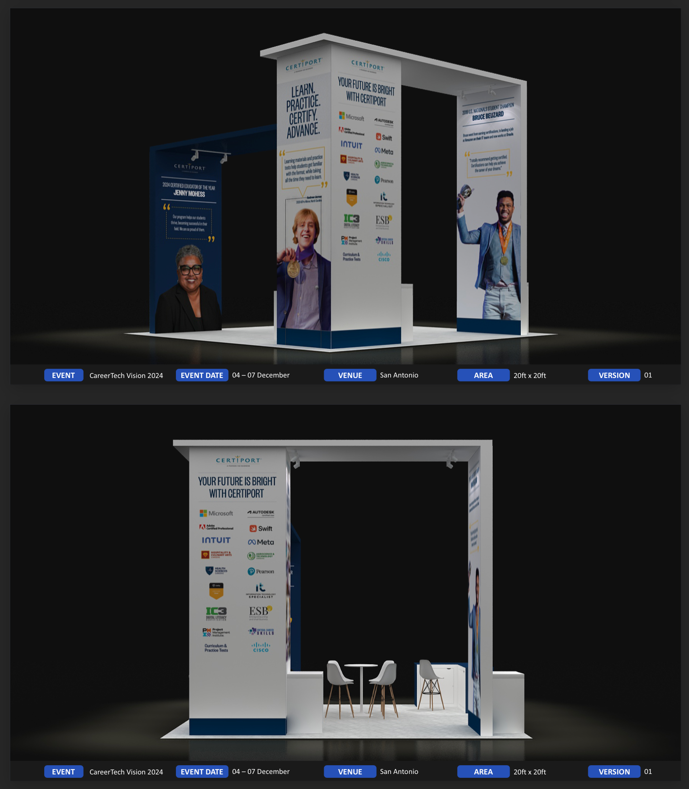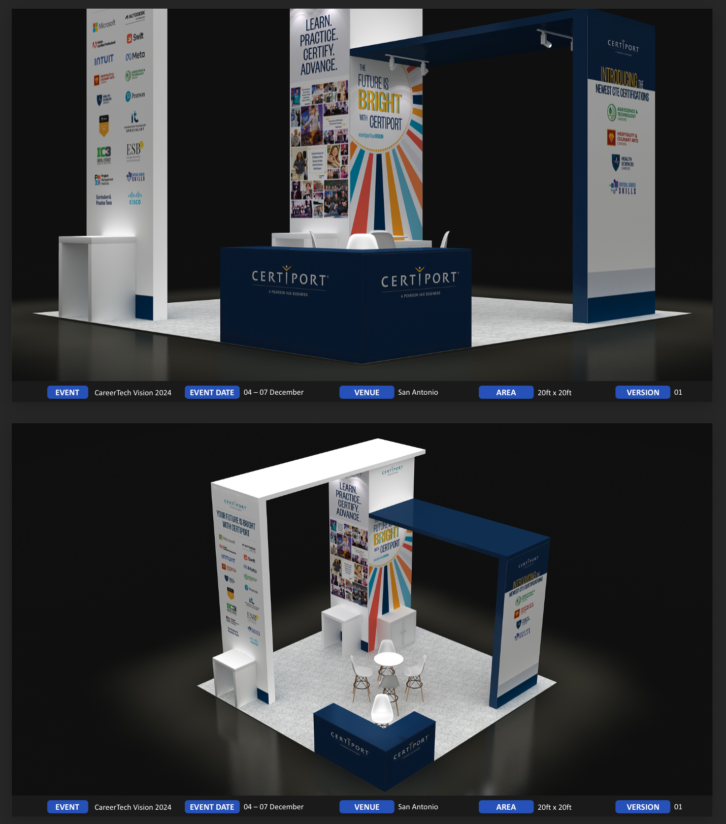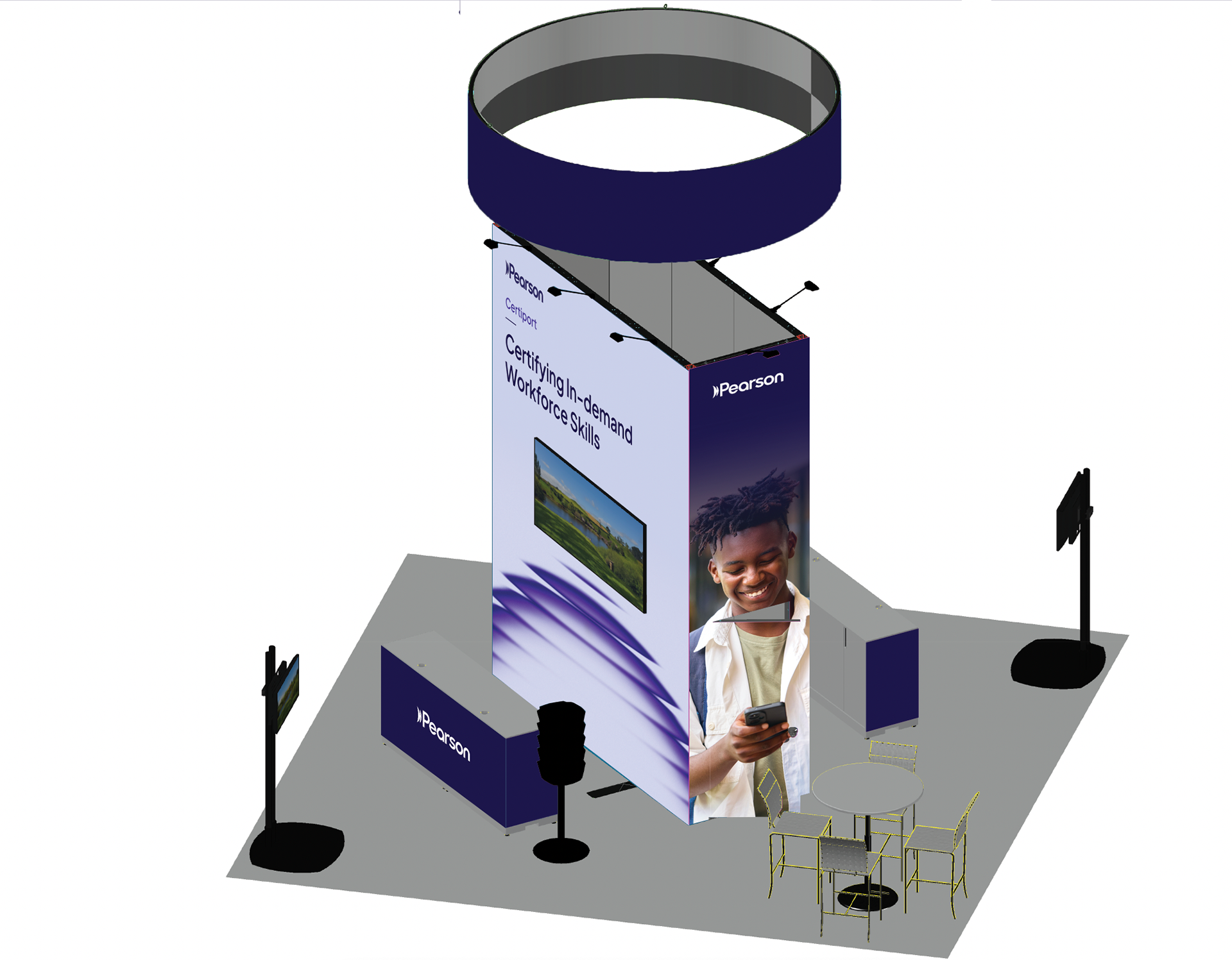In 2025 the Certiport tradeshow booth needed to update to reflect more Pearson's new brand. The images above are what I worked on for the new booth (I worked with another designer who did the sides) and below is how the booth looked in real life.